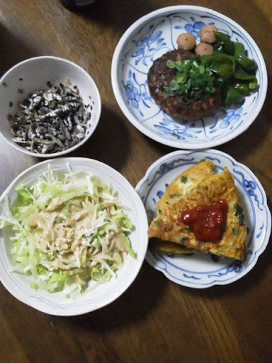 昨日の晩御飯は、割と高級な冷凍ハンバーグ、ミニウインナー、ピーマンの炒め物、オムレツ、キャベツの千切り、そして、小魚の胡麻和えでした。