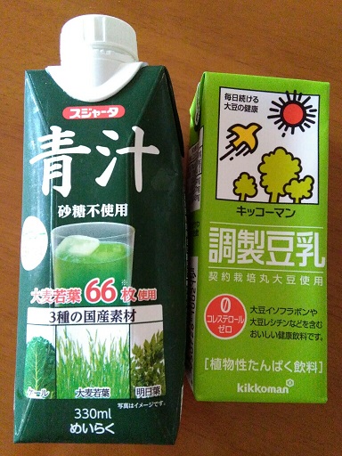 最近、毎日飲んでいるスジャータめいらくの青汁(砂糖不使用)に、今日はキッコーマンの調整豆乳を混ぜてみました。
